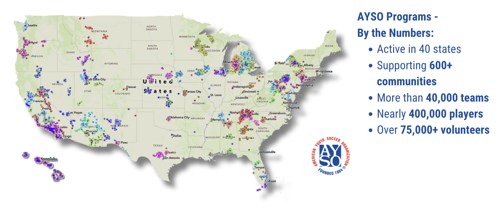 Beginning with only nine teams and a handful of soccer enthusiasts, AYSO was established in 1964 out of a garage in Torrance, California. The goal was, and still is, to ensure that kids have the opportunity to be introduced to the beautiful game of soccer. AYSO was the first organization to give female athletes an equal opportunity in sports, predating Title IX. More than 50 years later, AYSO now has thriving programs for kids and adults in nearly 900 communities all over the country as well as internationally in the Virgin Islands and Trinidad and Tobago. With over eight million AYSO alumni, we are a name that’s synonymous with excellence and recognized nationwide.