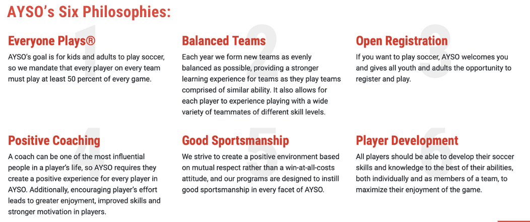 MISSION: Develop and deliver quality youth soccer programs which promote a fun, family environment based on AYSO’s Six Philosophies.